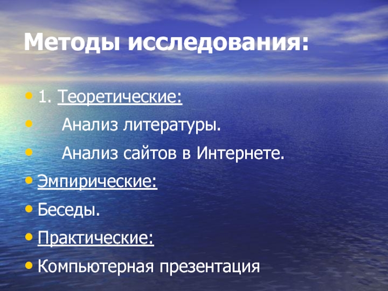 Методы исследования:1. Теоретические: 		Анализ литературы.		Анализ сайтов в Интернете.Эмпирические:Беседы.Практические:Компьютерная презентация