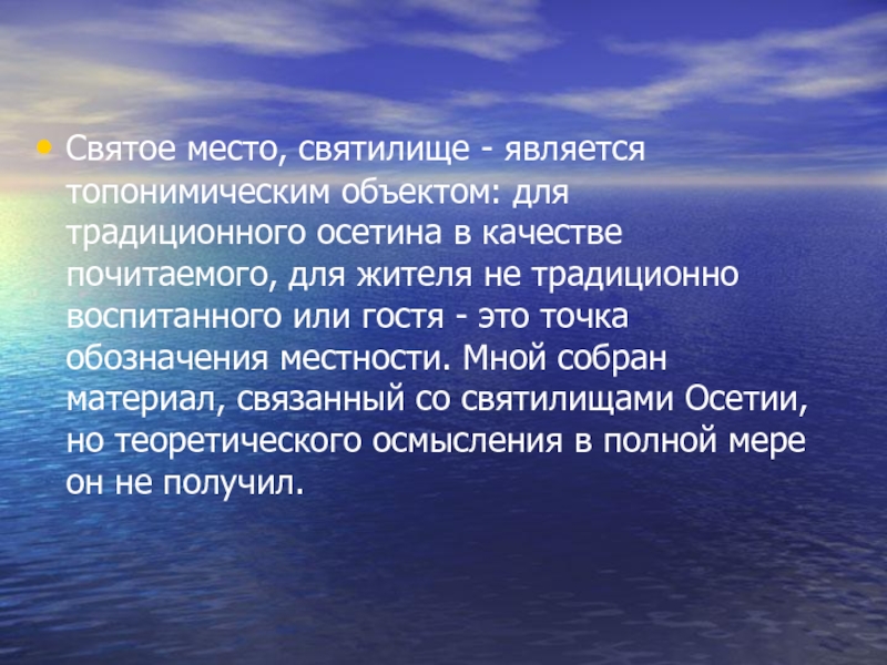Слайд 7Святое место, святилище - является топонимическим объектом: для традиционного осетина