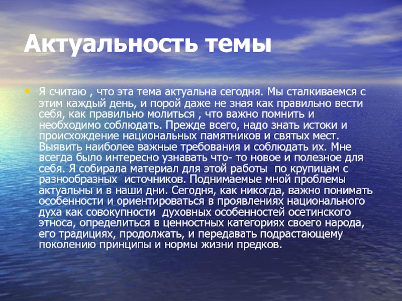 зная как правильно вести себя, как правильно молиться , что важно помнить и необходимо соблюдать. Прежде всего, надо знать истоки и происхождение национальных памятников и святых мест. Выявить наиболее важные требования и соблюдать их. Мне всегда было интересно узнавать что- то новое и полезное для себя. Я собирала материал для этой работы по крупицам с разнообразных источников. Поднимаемые мной проблемы актуальны и в наши дни. Сегодня, как никогда, важно понимать особенности и ориентироваться в проявлениях национального духа как совокупности духовных особенностей осетинского этноса, определиться в ценностных категориях своего народа, его традициях, продолжать, и передавать подрастающему поколению принципы и нормы жизни предков.