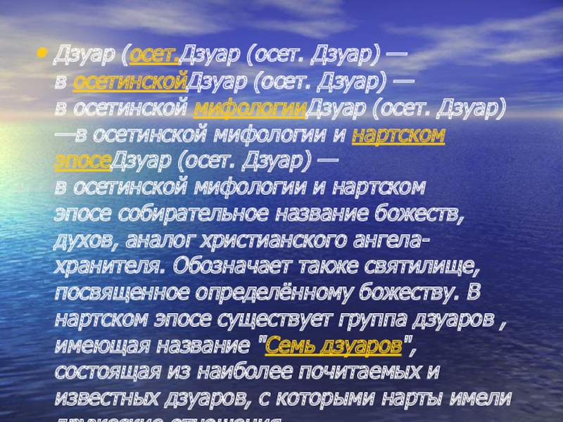 Слайд 6Дзуар (осет.Дзуар (осет. Дзуар) —в осетинскойДзуар (осет. Дзуар) —в осетинской мифологииДзуар (осет. Дзуар) —в осетинской мифологии и нартском эпосеДзуар (осет. Дзуар) —в осетинской мифологии и нартском эпосе собирательное название божеств, духов, аналог христианского ангела-хранителя. Обозначает