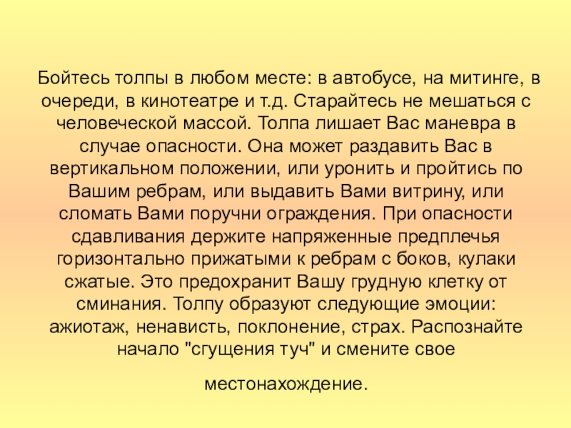 массой. Толпа лишает Вас маневра в случае опасности. Она может раздавить Вас в вертикальном положении, или уронить и пройтись по Вашим ребрам, или выдавить Вами витрину, или сломать Вами поручни ограждения. При опасности сдавливания держите напряженные предплечья горизонтально прижатыми к ребрам с боков, кулаки сжатые. Это предохранит Вашу грудную клетку от сминания. Толпу образуют следующие эмоции: ажиотаж, ненависть, поклонение, страх. Распознайте начало "сгущения туч" и смените свое местонахождение.