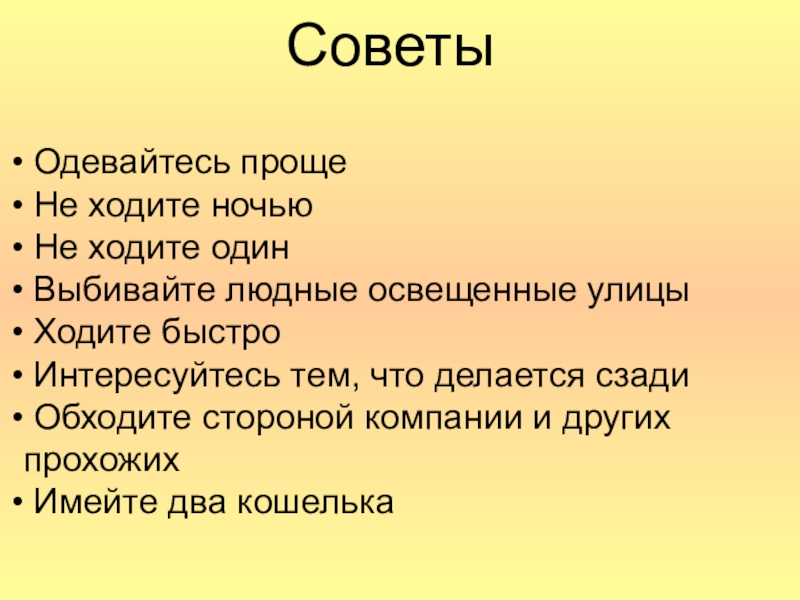 готовностью встретить уличные опасности, не ходите по улице с наушниками, то есть не слушайте попутно магнитофон или радио: можно не услышать приближающийся автомобиль, подкрадывающегося сзади негодяя или чье-то последнее предупреждение.