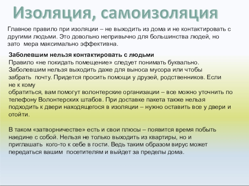 Слайд 4Главное правило при изоляции – не выходить из дома и