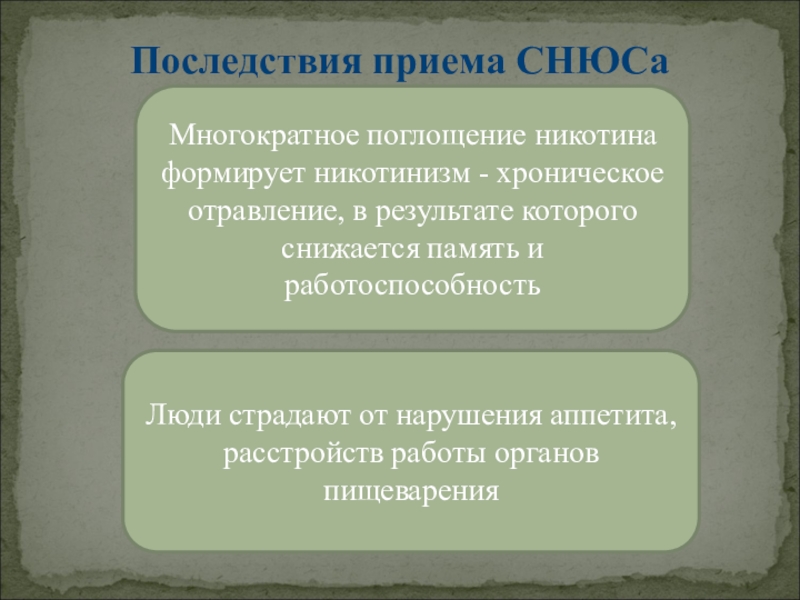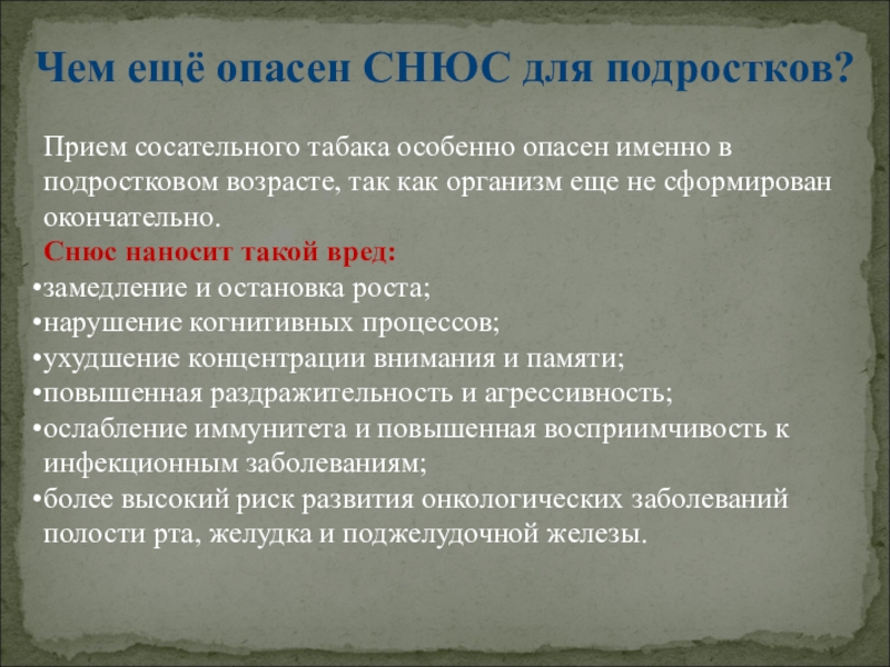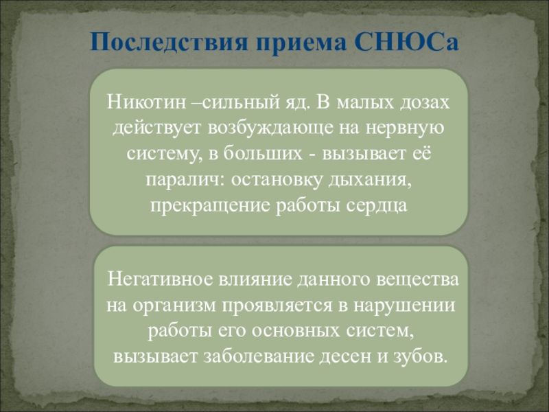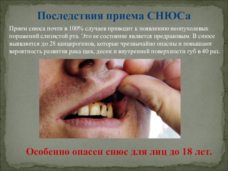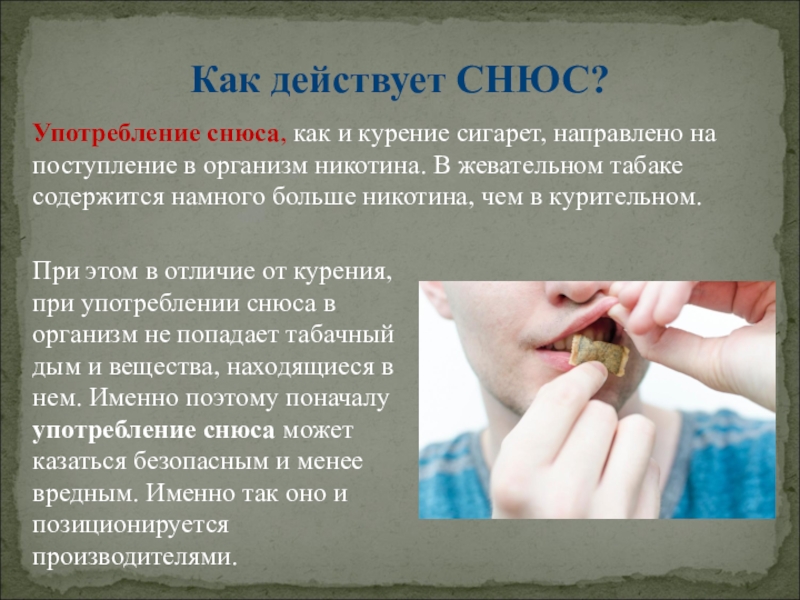 При этом в отличие от курения, при употреблении снюса в организм не попадает табачный дым и вещества, находящиеся в нем. Именно поэтому поначалу употребление снюса может казаться безопасным и менее вредным. Именно так оно и позиционируется производителями.