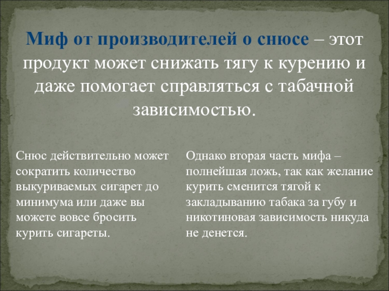 Однако вторая часть мифа – полнейшая ложь, так как желание курить сменится тягой к закладыванию табака за губу и никотиновая зависимость никуда не денется.