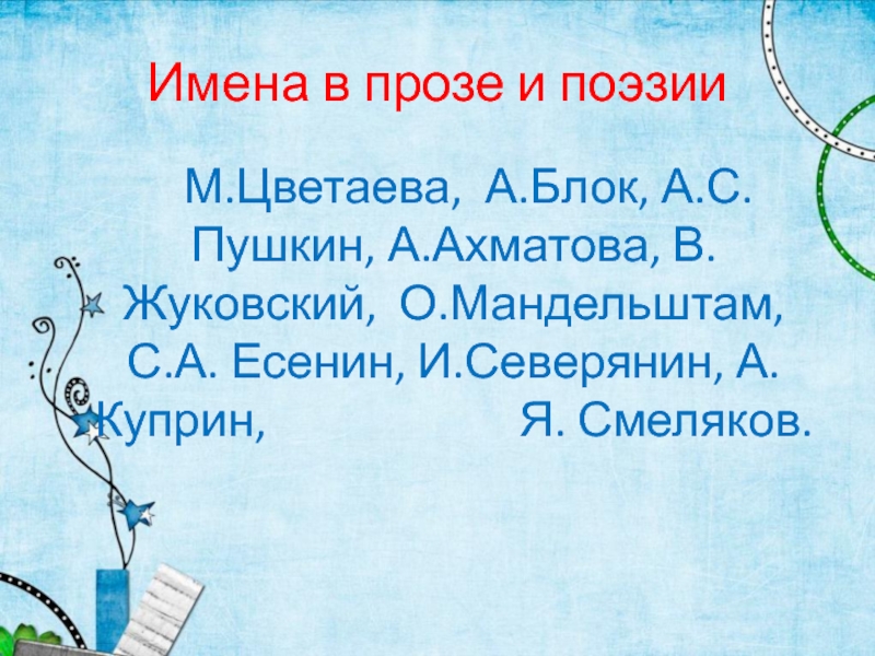А.С.Пушкин, А.Ахматова, В.Жуковский, О.Мандельштам, С.А. Есенин, И.Северянин, А. Куприн,