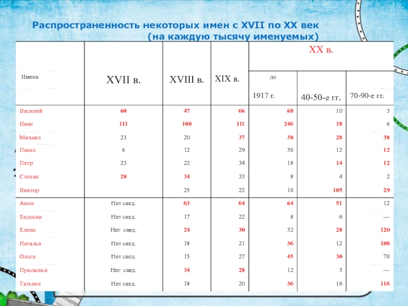Слайд 10Распространенность некоторых имен с XVII по XX век (на каждую