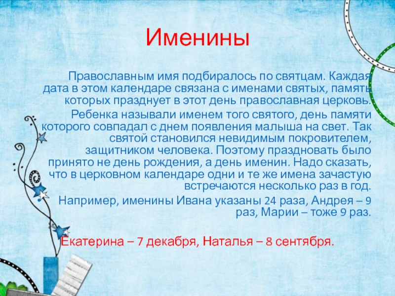 Ребенка называли именем того святого, день памяти которого совпадал с днем появления малыша на свет. Так святой становился невидимым покровителем, защитником человека. Поэтому праздновать было принято не день рождения, а день именин. Надо сказать, что в церковном календаре одни и те же имена зачастую встречаются несколько раз в год.