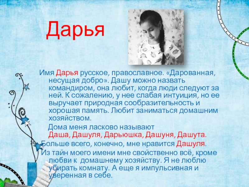 Имя Дарья русское, православное. «Дарованная, несущая добро». Дашу можно назвать