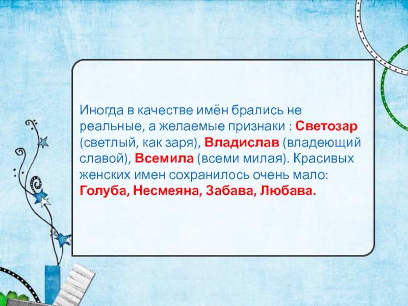 милая). Красивых женских имен сохранилось очень мало: Голуба, Несмеяна, Забава, Любава.