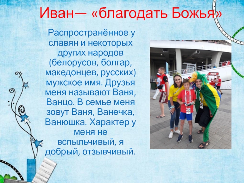 называют Ваня, Ванцо. В семье меня зовут Ваня, Ванечка, Ванюшка. Характер у меня не вспыльчивый, я добрый, отзывчивый.