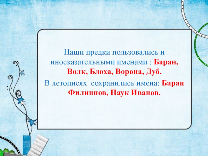 Наши предки пользовались и иносказательными именами : Баран, Волк, Блоха,