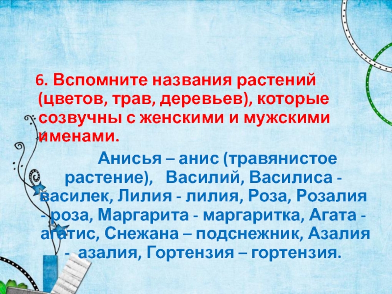 Слайд 30 6. Вспомните названия растений (цветов, трав, деревьев), которые