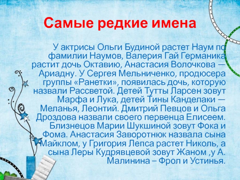 дочь Октавию, Анастасия Волочкова — Ариадну. У Сергея Мельниченко, продюсера группы «Ранетки», появилась дочь, которую назвали Рассветой. Детей Тутты Ларсен зовут Марфа и Лука, детей Тины Канделаки — Меланья, Леонтий. Дмитрий Певцов и Ольга Дроздова назвали своего первенца Елисеем. Близнецов Марии Шукшиной зовут Фока и Фома. Анастасия Заворотнюк назвала сына Майклом, у Григория Лепса растет Николь, а сына Леры Кудрявцевой зовут Жаном ,у А.Малинина – Фрол и Устинья.