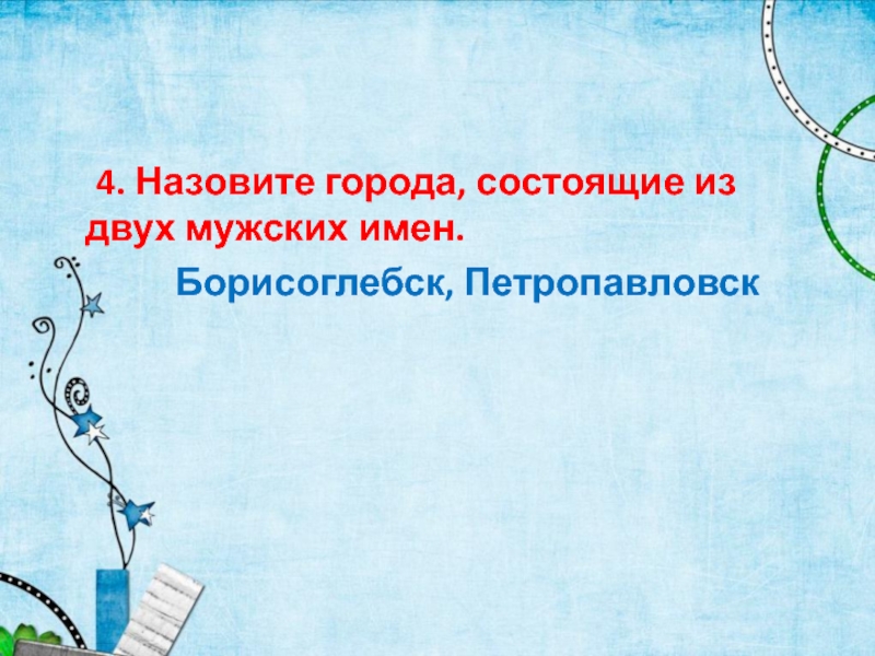Слайд 28 4. Назовите города, состоящие из двух мужских