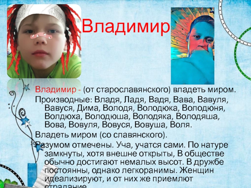 : Светозар (светлый, как заря), Владислав (владеющий славой), Всемила (всеми