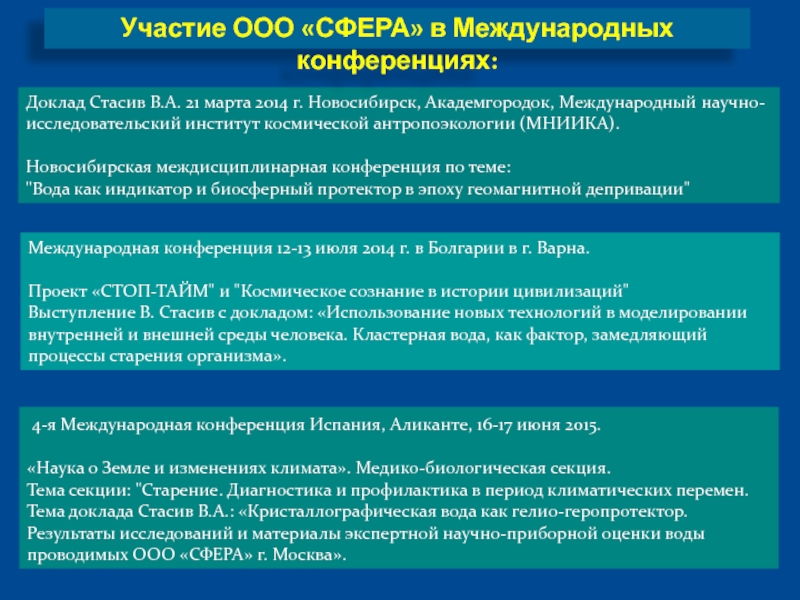 Выступление В. Стасив с докладом: «Использование новых технологий в моделировании внутренней и внешней среды человека. Кластерная вода, как фактор, замедляющий процессы старения организма».