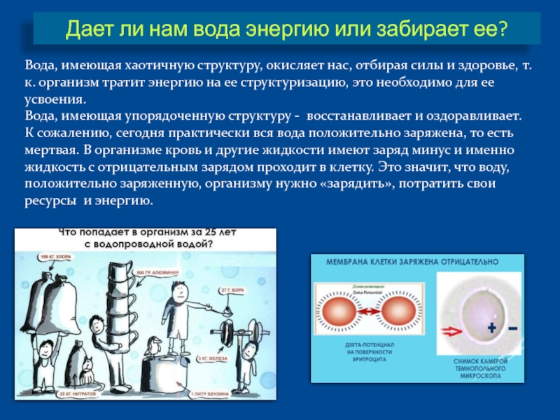 К сожалению, сегодня практически вся вода положительно заряжена, то есть мертвая. В организме кровь и другие жидкости имеют заряд минус и именно жидкость с отрицательным зарядом проходит в клетку. Это значит, что воду, положительно заряженную, организму нужно «зарядить», потратить свои ресурсы и энергию.