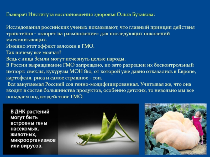 Вся закупаемая Россией соя генно-модифицированная. Учитывая же, что она входит в состав большинства продуктов, особенно детских, то невольно мы все попадаем под воздействие ГМО.