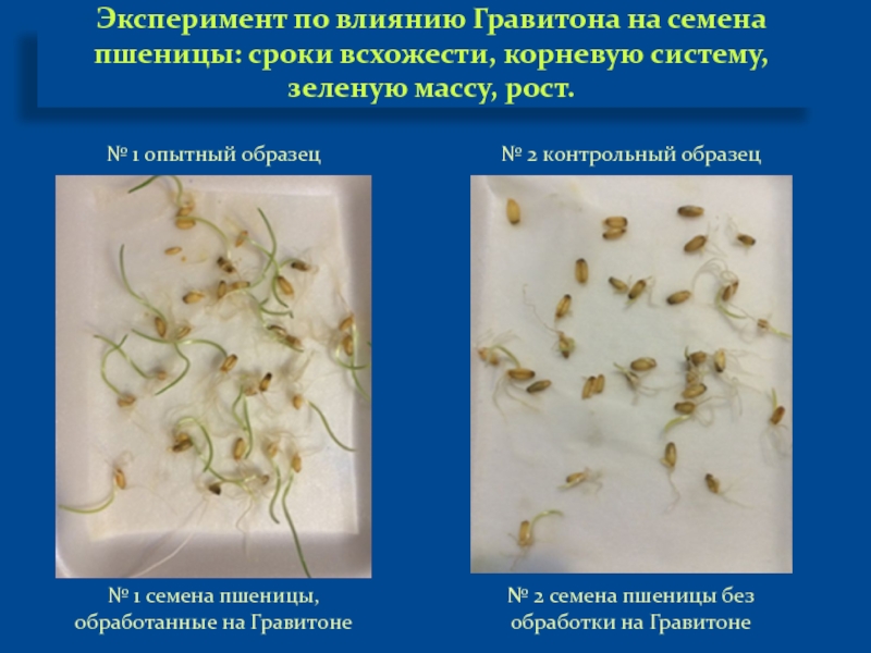 Слайд 38Эксперимент по влиянию Гравитона на семена пшеницы: сроки всхожести, корневую