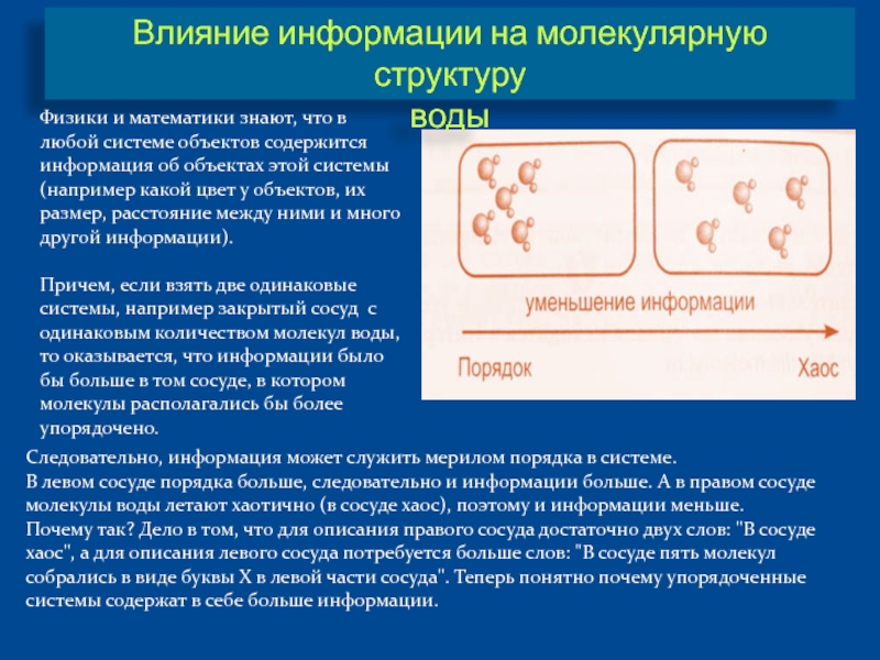 Причем, если взять две одинаковые системы, например закрытый сосуд с одинаковым количеством молекул воды, то оказывается, что информации было бы больше в том сосуде, в котором молекулы располагались бы более упорядочено.