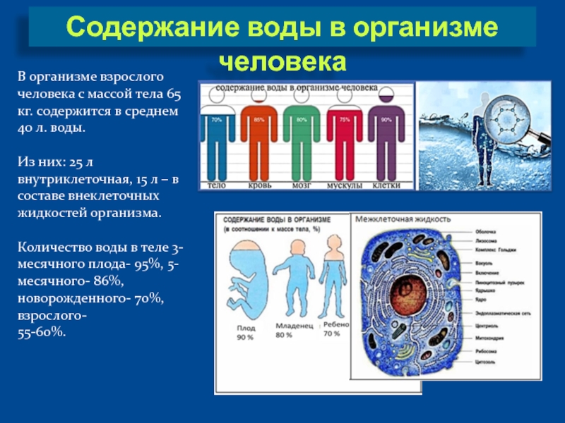Количество воды в теле 3-месячного плода- 95%, 5-месячного- 86%, новорожденного- 70%, взрослого-