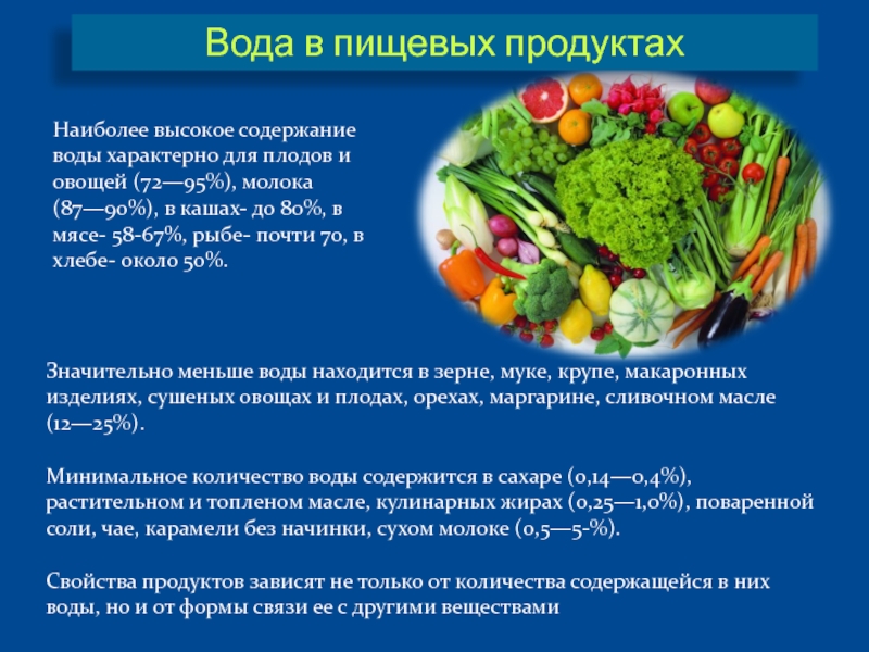 Слайд 3Наиболее высокое содержание воды характерно для плодов и овощей (72—95%),