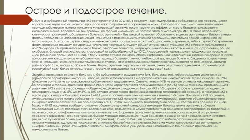 заболевания, как правило, имеет характерные черты инфекционного процесса и часто протекает с поражением кожи. Наиболее частым симптомом в начальном периоде заболевания является появление мигрирующей эритемы вокруг первичного аффекта - места бывшего присасывания иксодового клеща. Характерный вид эритемы, ее форма и локализация, частота этого симптома при ИКБ, а также особенности клинических проявлений заболевания у больных с эритемой и без таковой позволяет обоснованно выделять эритемную и безэритемную формы заболевания. Заболевание может начинаться с появления мигрирующей эритемы или симптомов общей инфекционной интоксикации. Во втором случае, синдром интоксикации в последствии может либо дополняться эритемой, либо в случаях безэритемных форм оставаться ведущим синдромом начального периода. Синдром общей интоксикации у больных ИКБ в России наблюдается в 60-70% случаев. Он проявляется головной болью, ознобами, тошнотой, мигрирующими болями в костях и мышцах, артралгиями, общей слабостью, быстрой утомляемостью, лихорадкой от субфебрильной до 40°С. Лихорадочный период может продолжаться несколько дней (обычно не превышает 15 дней). В большинстве случаев синдром общей инфекционной интоксикации выражен умеренно.В месте присасывания клеща в конце инкубационного периода больные отмечают небольшой зуд, иногда боль и наблюдается покраснение кожи с небольшой инфильтрацией подкожной клетчатки. Пятно гиперемии кожи постепенно увеличивается по периферии, достигая размеров 5-15 см, иногда до 50 см и более. Форма эритемы округлая или овальная, очень редко неопределенная. Наружный край воспаленной кожи более гиперемирован, несколько возвышается над уровнем здоровой кожи.