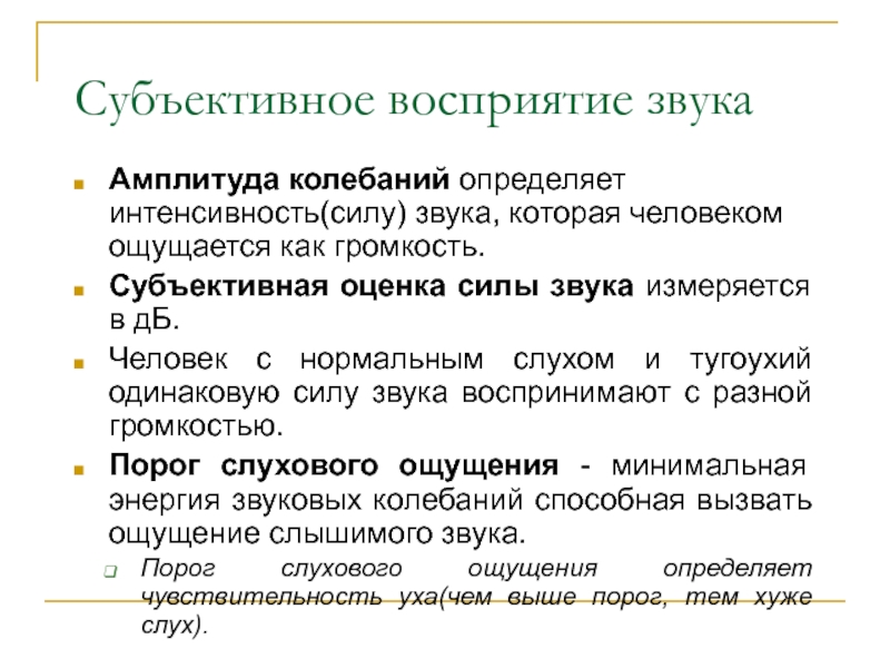 Порог слухового ощущения определяет чувствительность уха(чем выше порог, тем хуже слух).