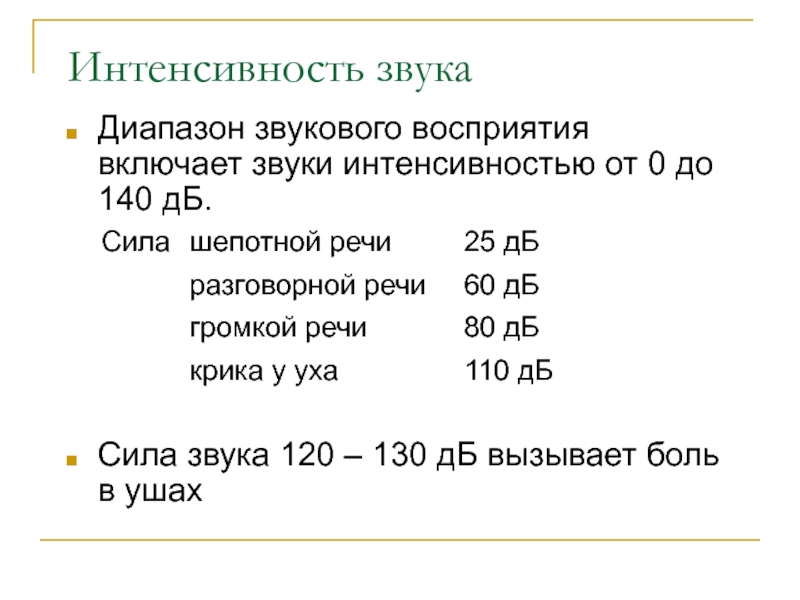 Диапазон звукового восприятия включает звуки интенсивностью от 0 до