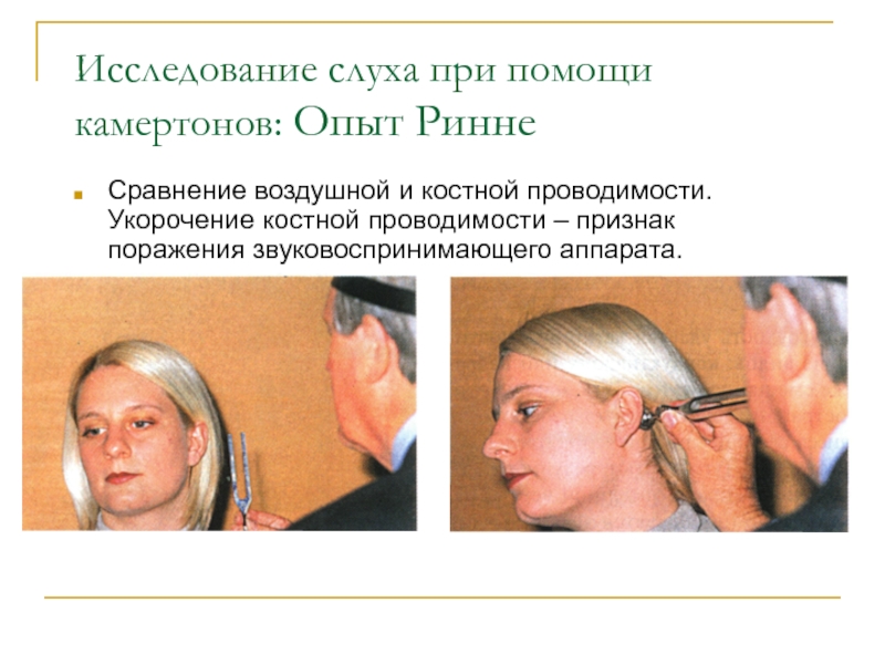 Слайд 33Исследование слуха при помощи камертонов: Опыт Ринне