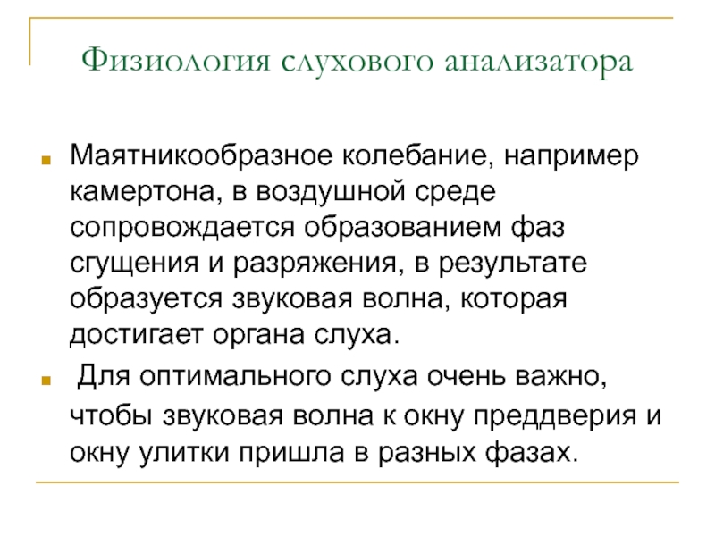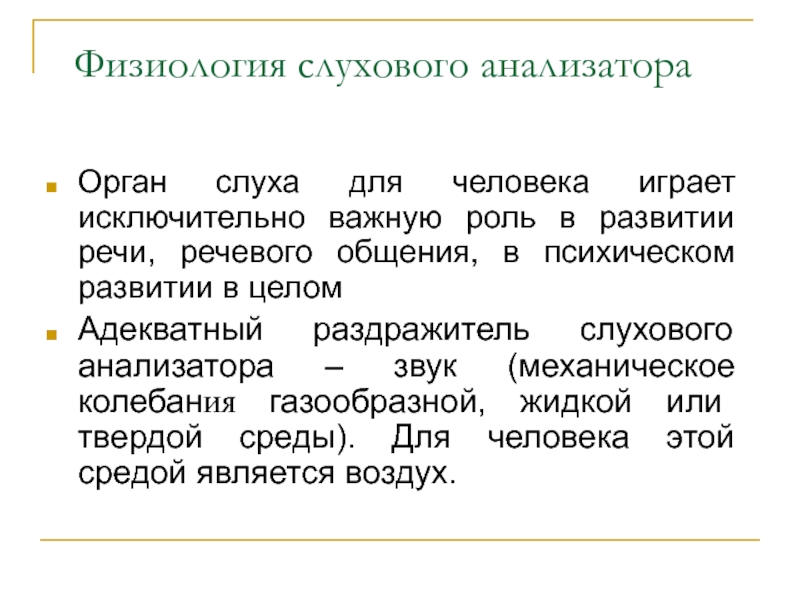 раздражитель слухового анализатора – звук (механическое колебания газообразной, жидкой или твердой среды). Для человека этой средой является воздух.