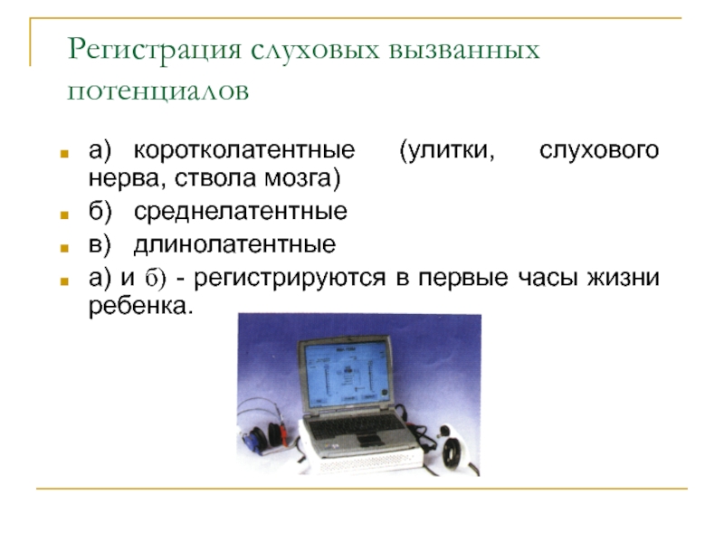 а) коротколатентные (улитки, слухового нерва, ствола мозга)