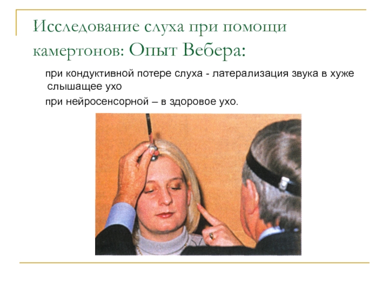 Слайд 32Исследование слуха при помощи камертонов: Опыт Вебера: