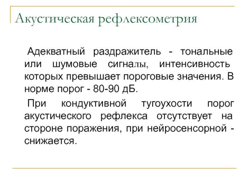 тугоухости порог акустического рефлекса отсутствует на стороне поражения, при нейросенсорной - снижается.
