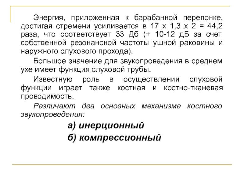 Слайд 20Энергия, приложенная к барабанной перепонке, достигая стремени усиливается в 17