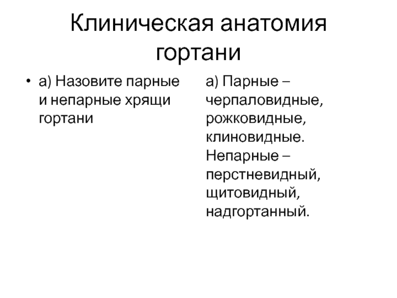 – черпаловидные, рожковидные, клиновидные. Непарные – перстневидный, щитовидный, надгортанный.