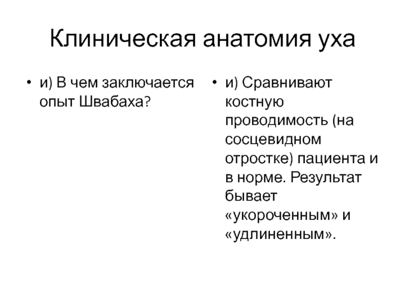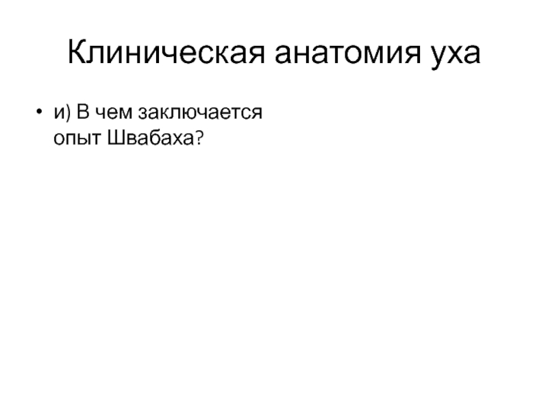 воздушная проводимость? г) Что такое костная проводимость? д) Что относится к звуковоспринимающему аппарату? е) Какие существуют виды исследования слуха речью? ж) В чем заключается опыт Вебера? з) В чем заключается опыт Ринне? и) В чем заключается опыт Швабаха? к) Что такое аудиометрия?