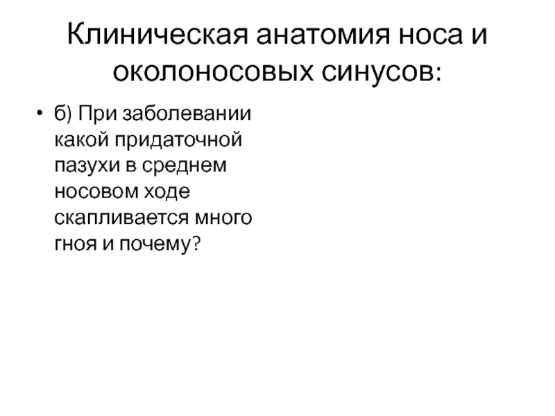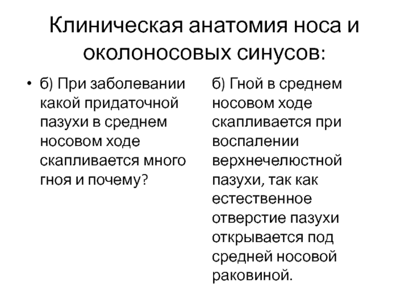 б) Гной в среднем носовом ходе скапливается при воспалении верхнечелюстной пазухи, так как естественное отверстие пазухи открывается под средней носовой раковиной.
