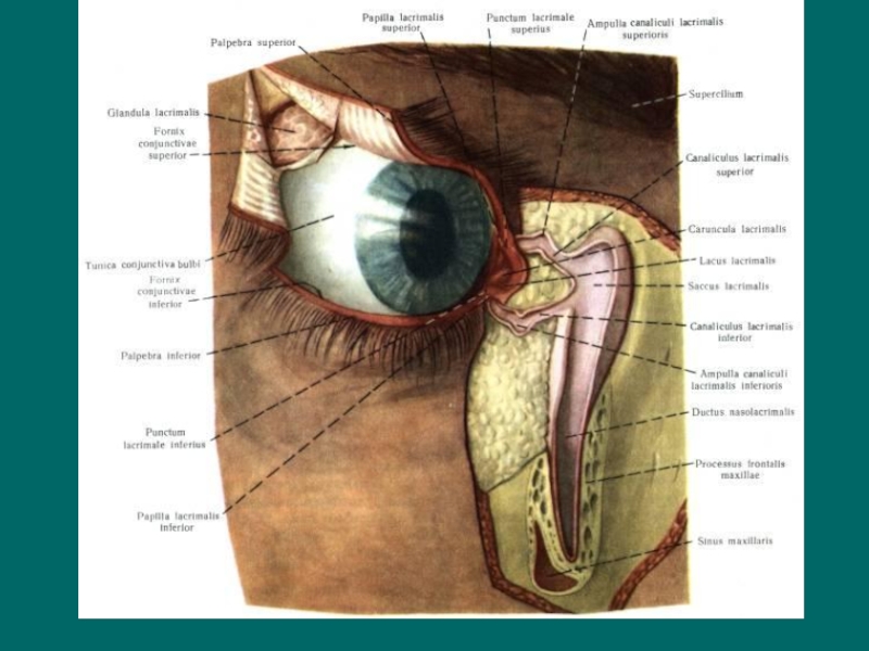 Слайд 27Кнаружи края век соединяются под острым углом, образуя наружную спайку.