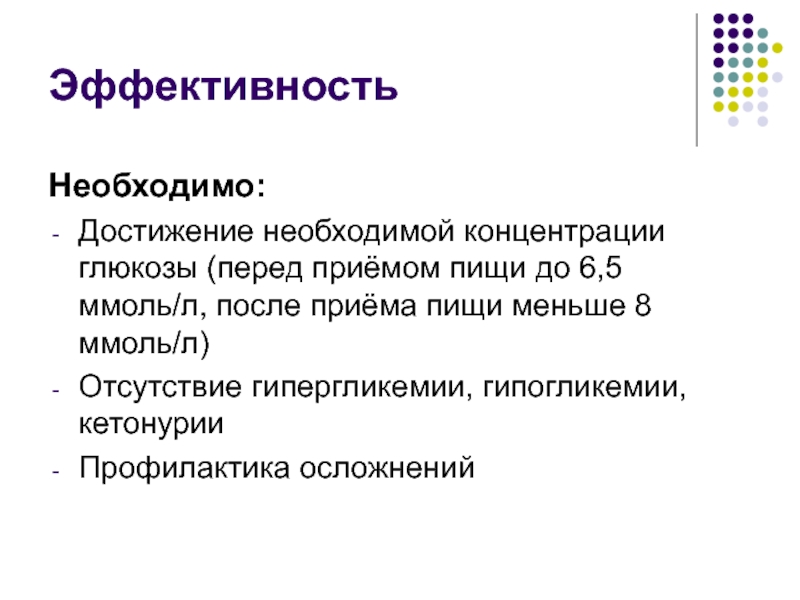 Достижение необходимой концентрации глюкозы (перед приёмом пищи до 6,5 ммоль/л,