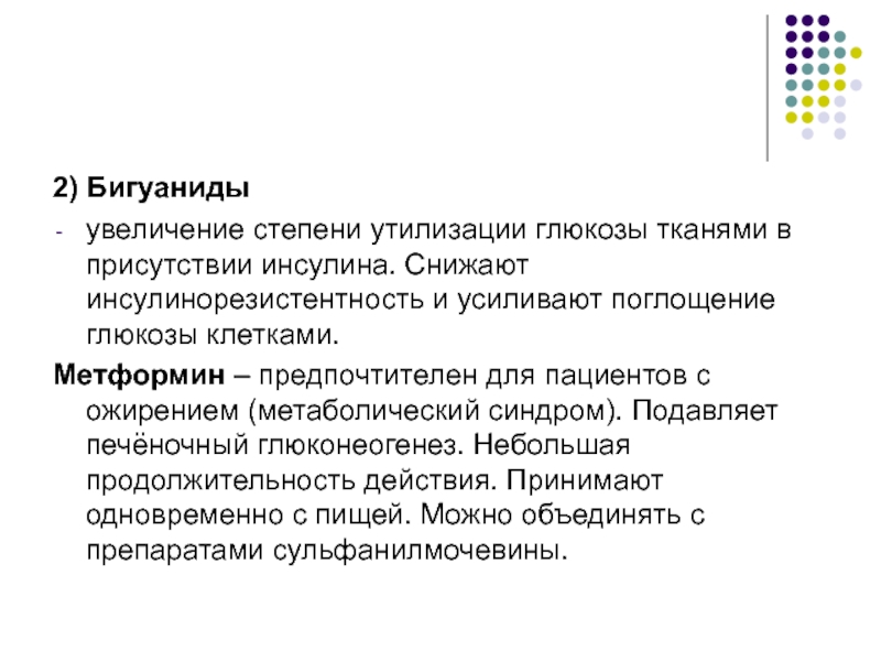 с ожирением (метаболический синдром). Подавляет печёночный глюконеогенез. Небольшая продолжительность действия. Принимают одновременно с пищей. Можно объединять с препаратами сульфанилмочевины.