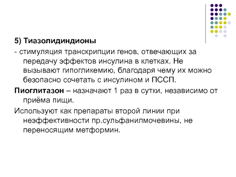 Используют как препараты второй линии при неэффективности пр.сульфанилмочевины, не переносящим метформин.