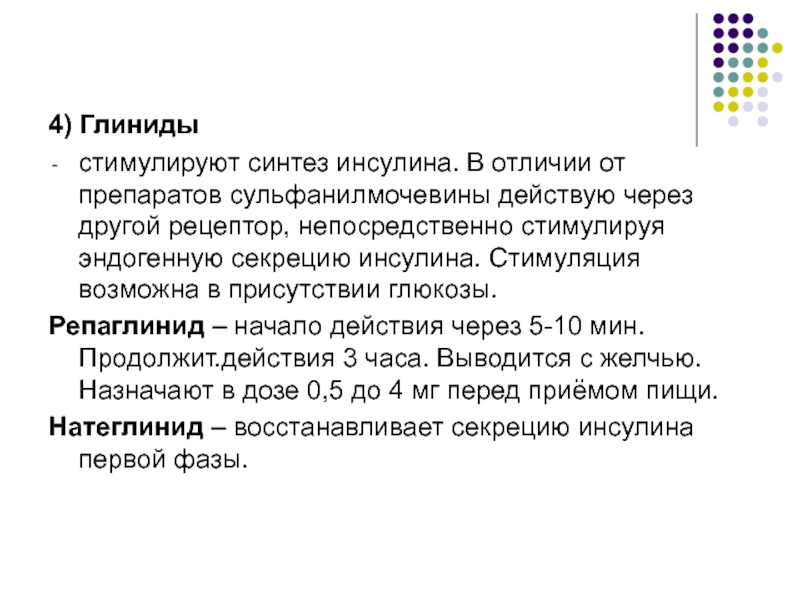 стимулируют синтез инсулина. В отличии от препаратов сульфанилмочевины действую