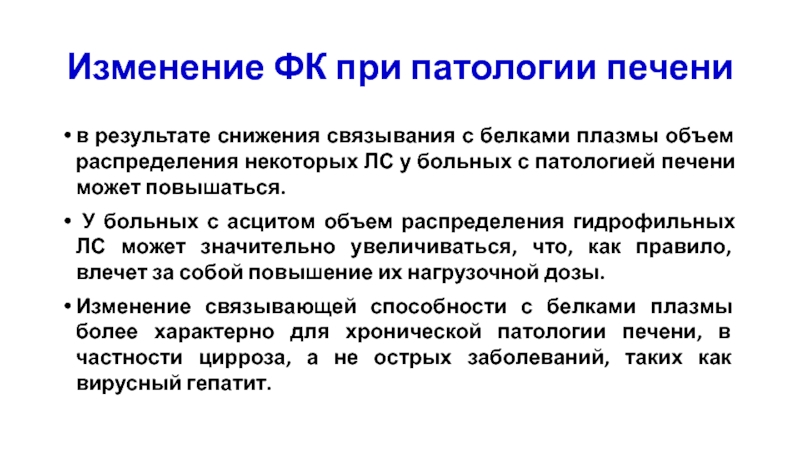 У больных с асцитом объем распределения гидрофильных ЛС может значительно увеличиваться, что, как правило, влечет за собой повышение их нагрузочной дозы.