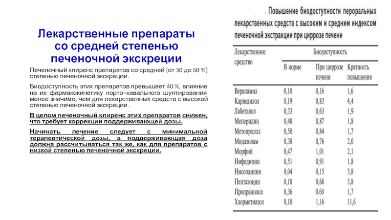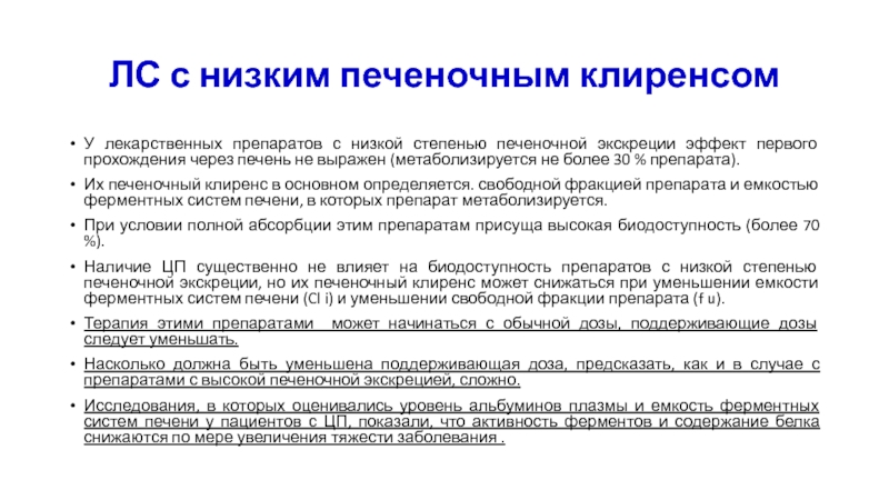 Слайд 42Препараты, медленно метаболизирующиеся в печени с низким печеночным клиренсом при