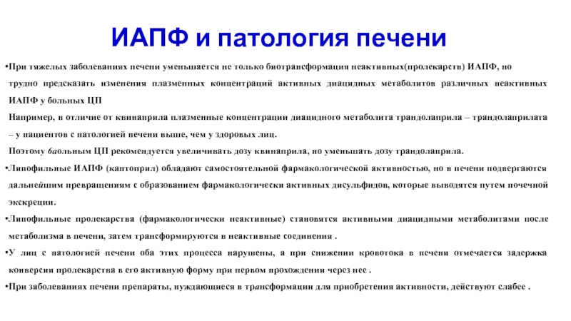 Слайд 26При тяжелых заболеваниях печени уменьшается не только биотрансформация неактивных(пролекарств) ИАПФ,