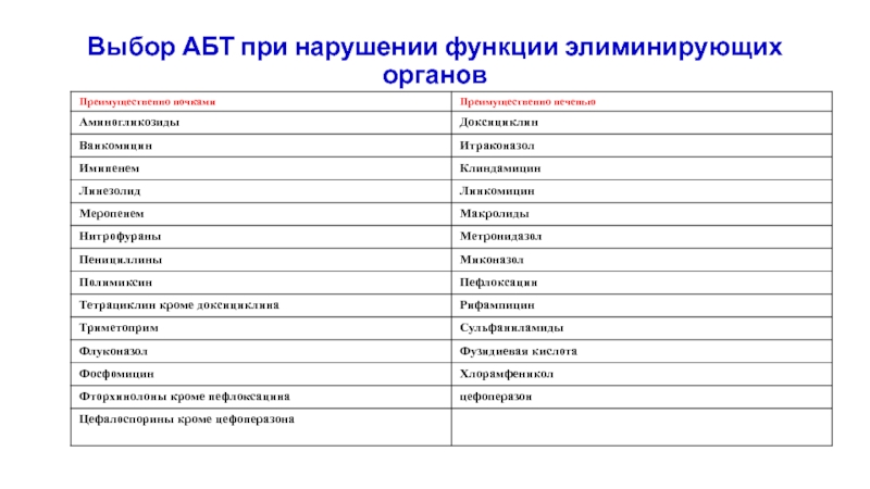 Слайд 14Выбор АБТ при нарушении функции элиминирующих органов