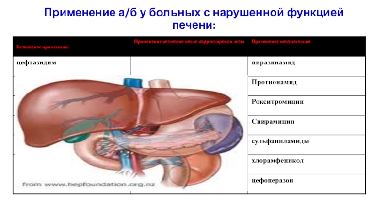 Слайд 23Применение а/б у больных с нарушенной функцией печени: