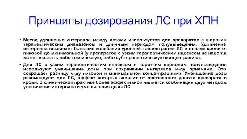 Для ЛС с узким терапевтическим индексом и коротким периодом полувыведения используют уменьшение дозы при сохранении интервала м-ду приемами. Это сокращает разницу м-ду пиковой и минимальной концентрациями. Уменьшение дозы рекомендуют для ЛС, эффект которых зависит от постоянного уровня препарата в крови. В клинической практике более эффективной является комбинация двух методов: увеличения интервала и уменьшения дозы ЛС.